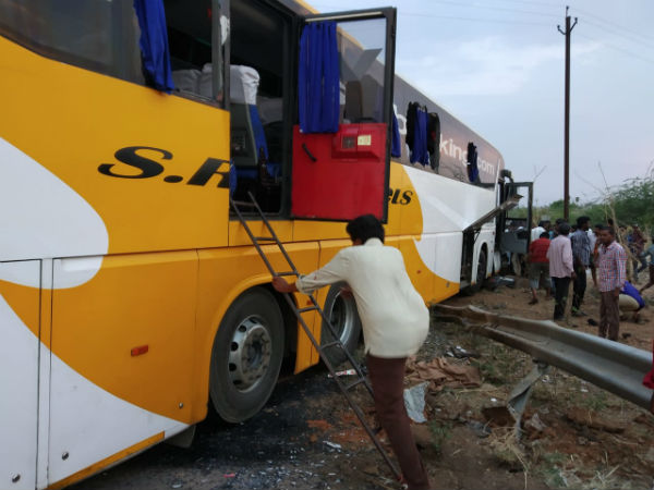 கர்னூல் மாவட்டம் வெல்துர்தி கிராஸ் ரோடு அருகே ஹைதராபாத் - பெங்களூர் தேசிய நெடுஞ்சாலையில் ஹைதராபாத்தில் இருந்து பெங்களூரு நோக்கி தனியார் சொகுசு பேருந்து சென்று கொண்டிருந்தது. அப்போது சாலையின் குறுக்கே ஒருவர் பைக் ஓட்டி வந்தார்.