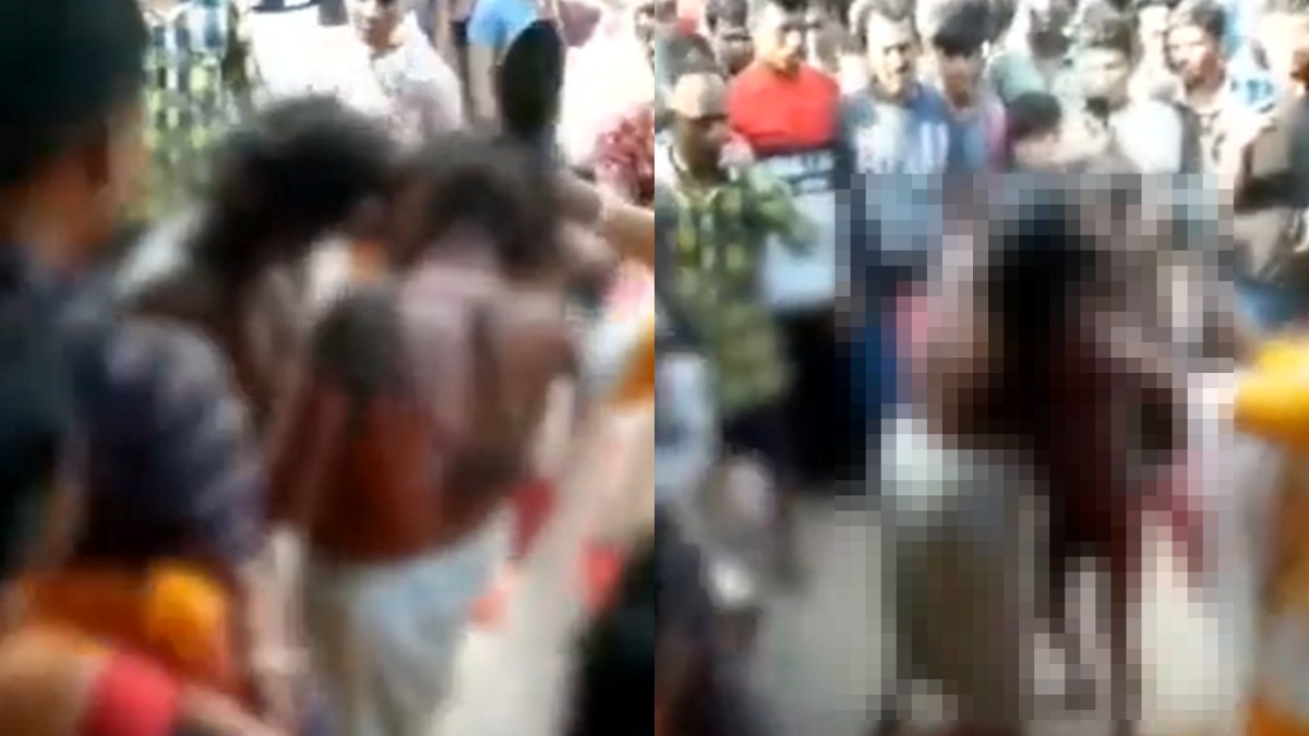 அப்போது அந்த 2 பெண்களும் திருடியதாக கூறியுள்ளனர். இதையடுத்து அங்கிருந்த பெண் வியாபாரிகள் அவரை பிடித்து சரமாரியாக தாக்கினர். மேலும் ஏராளமானவர்கள் சுற்றியிருக்க 2 பெண்களின் ஆடைகளை கிழித்து அரைநிர்வாணப்படுத்தி இழுத்து சென்றனர். இந்த வீடியோ தான் தற்போது இணையதளங்களில் வெளியாகி உள்ளது.