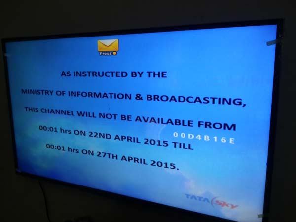 அல் ஜசீரா டிவி சானல் ஒளிபரப்பாகும் எண்ணில், மத்திய தகவல் ஒலிபரப்புத்துறையின் உத்தரவுப்படி இந்த சேனல், ஏப்ரல் 22ம் தேதி 00.01 மணியிலிருந்து 2015, ஏப்ரல் 27ம் தேதி 00.01 வரை ஒளிபரப்பப்பட மாட்டாது என்ற செய்தி இடம் பெற்றுள்ளது.