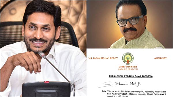 அமராவதி: மறைந்த பின்னணி பாடகர் எஸ்.பி. பாலசுப்ரமணியத்துக்கு பாரத ரத்னா விருது வழங்க வேண்டும் என்று பிரதமர் மோடிக்கு ஆந்திரா முதல்வர் ஜெகன் மோகன் ரெட்டி கடிதம் அனுப்பியுள்ளார்.