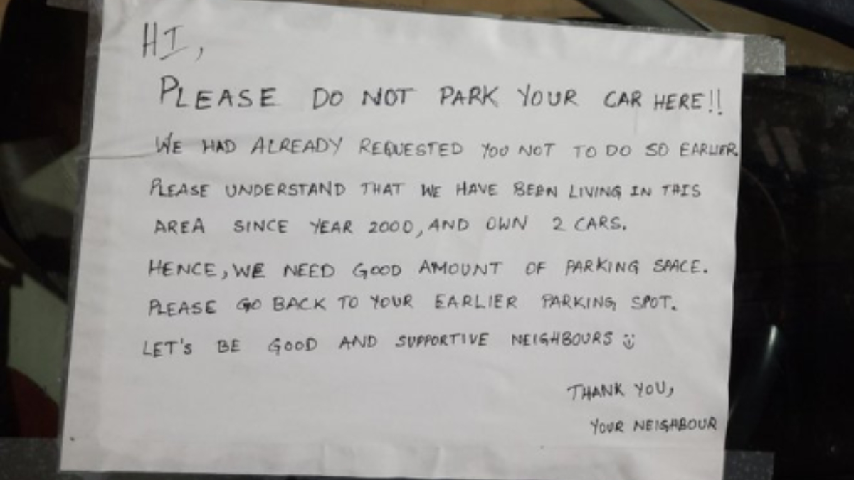 அதில், "ஹாய், தயவுசெய்து உங்கள் காரை இங்கே நிறுத்த வேண்டாம்.. இப்படி நிறுத்த வேண்டாம் என்று நாங்கள் ஏற்கனவே உங்களிடம் கோரிக்கை விடுத்திருந்தோம்... நாங்கள் 2000ம் ஆண்டு முதல் இந்தப் பகுதியில்தான் வசித்து வருகிறோம்.. அதுவுமில்லால் நாங்கள் 2 கார்கள் வைத்திருக்கிறோம் என்பதை நீங்கள் புரிந்து கொள்ளவும். அதனால், எங்களுக்கு போதுமான அளவு, பார்க்கிங் இடம் தேவையாக இருக்கிறது.