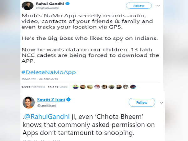 பிரதமர் நரேந்திர மோடியின் நமோ -பின் மீது குற்றம் சாட்டியதற்காக ராகுல் காந்தியை மத்திய அமைச்சர் ஸ்மிருதி இரானி டுவிட்டரில் கேலி செய்துள்ளார். ஸ்மிருதி இரானி தனது பதிவில் வேவு பார்பதற்காக நமோ செயலியில் எந்த விதமான வழிவகையும் செய்யப்படவில்லை என்று சோட்டா பீம் கார்டூன் கதாபாத்திரத்திற்குக் கூட தெரியும் என்று ராகுலை விமர்சித்துள்ளார்.