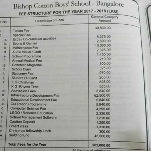 பெங்களூர் எம்.ஜி.ரோடு அருகேயுள்ள செயின்ட் மார்க்ஸ் சாலையில் உள்ளது பிஷப் காட்டன் ஆண்கள் பள்ளி. இப்பள்ளியின் 2017-18ம் கல்வி ஆண்டுக்கான, கட்டண கையேடுதான் இப்படி வைரலாகியுள்ளது.