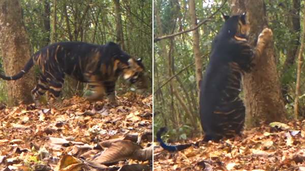 இந்த நிலையில்தான் ஒடிசா காட்டு பகுதியில் எடுக்கப்பட்ட வீடியோ ஒன்று இணையம் முழுக்க வைரலாகி வருகிறது. இந்த 15 நொடி வீடியோவில் கருப்பு நிறத்தில் வினோதமான விலங்கு ஒன்று மரத்தின் மீது சாய்ந்து இருப்பது போன்ற காட்சிகள் உள்ளன. பார்த்ததும் முதலில் கரடி போல இருக்கும் இந்த விலங்கை பார்த்து பலர் குழம்பும் அளவிற்கு வித்தியாசமாக உள்ளது. பார்க்கவே பயங்கரமாக, உறைய வைக்கும் அளவிற்கு இந்த விலங்கு காட்சி அளிக்கிறது. இதன் உடல் முழுக்க கோடுகளும் உள்ளன.
