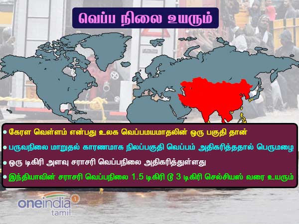 "கடந்த பத்தாண்டுகளில் பருவநிலை மாறுதல் காரணமாக நிலப்பகுதி வெப்பம் அதிகரித்ததால், மத்திய மற்றும் தென்இந்தியாவில் பருவ மழைப்பொழிவு அதிகரித்துள்ளது" என்கிறார் ரஷ்யாவின் அறிவியல் அகாடமியை சேர்ந்த பருவமழை நிபுணரும், பேராசிரியருமான எலேனா சரோவ்யத்கினா. பூமி தொழில்மயமாதல் காலத்திற்கு முன்பாக இருந்ததை விட இப்போது ஒரு டிகிரி அளவுக்கு சராசரி வெப்பநிலை அதிகரிப்பை சந்தித்துள்ளது. இந்த மாற்றத்திற்கே இவ்வளவு பெரிய பேரழிவுகளை உலகம் சந்திக்க ஆரம்பித்துள்ளது. இதே நிலை நீடித்தால் இந்தியாவின் சராசரி வெப்பநிலை 1.5 டிகிரி செல்சியஸ் முதல் 3 டிகிரி செல்சியஸ் வரை உயரக்கூடும்.