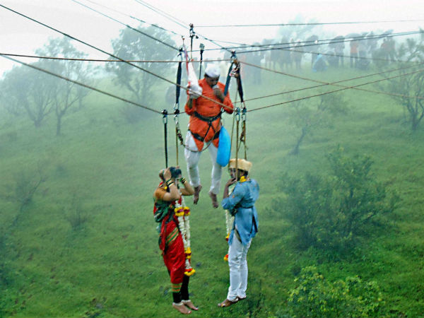இதையடுத்து, மேற்குத் தொடர்ச்சி மலைப்பகுதியில் அமைந்துள்ள விஷாலகாதா மற்றும் பன்ஹாலா சிகரங்களை இணைக்கும் வகையில் 600 அடி உயரத்தில் உறுதியான பிளாஸ்டிக் கயிறுகள் கட்டப்பட்டன. பின்னர் தம்பதிகள் இருவரும் பாரம்பரிய மகாராஷ்டிர உடைகளை அணிந்து கொண்டு, கயிற்றில் தொங்கியபடி ஜெய்தீப்பும், ரேஷ்மாவும் கயிற்றின் மையப்பகுதிக்கு சென்றனர்.