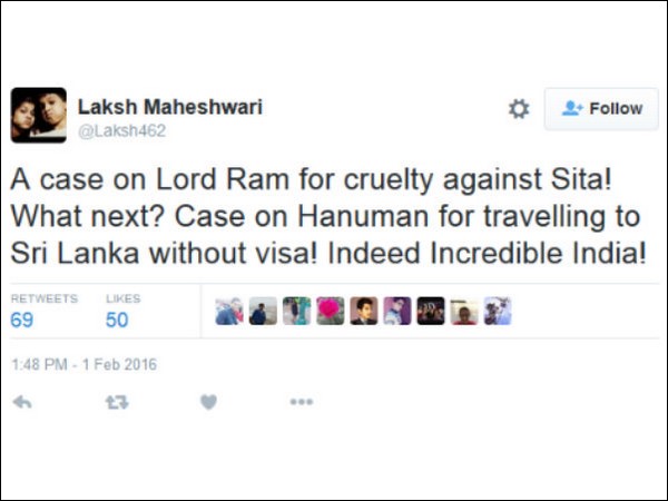 ராமர் மீதே கேஸா என்று பலரும் அதிர்ச்சியாகி விட்டனர். இந்த நிலையில் பேஸ்புக்கிலும் டிவிட்டரிலும் பலர் அனுமாரை வம்பிக்கிழுக்க ஆரம்பித்துள்ளனர்.