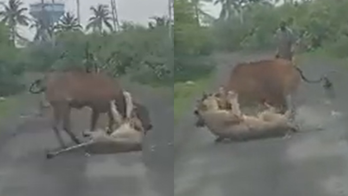 பசுவின் உரிமையாளர்: சிங்கத்தின் பிடியில் இருந்து விடுபட அந்த மாடும் மிகத் தீவிரமாக முயல்கிறது. இருப்பினும், அதன் முயற்சி பலனளிக்கவில்லை. இவை அத்தனையும் சாலையின் நடுவில் நடக்கிறது. அந்த அந்த மாட்டின் உரிமையாளரான விவசாயி ஒருவர், சிங்கத்தை நோக்கி துணிச்சலாகச் சென்றுள்ளார். மேலும், கையை உயர்த்தியும் சத்தம் போட்டும் சிங்கத்தை விரட்ட முயன்றார்.
