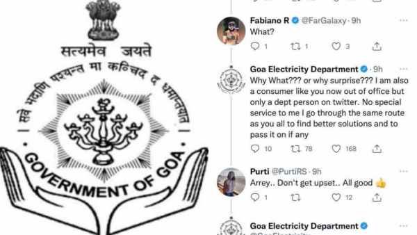 கோவா மின்வாரியம் தனது ட்விட்டரில், "நானும் உங்களைப் போன்ற ஒரு சாதாரண நுகர்வோர் தான். இப்போது நான் அலுவலகத்தில் இல்லை. ட்விட்டரில் தளத்தில் இருக்கும் ஒரே டிபார்ட்மென்ட் நபர் நான் மட்டும் தான். ஆனால், எனக்கு எந்த சிறப்புச் சேவையும் இல்லை. நீங்கள் எதிர்கொள்ளும் அதே சிக்கலைத் தான் நானும் தொடர்ந்து கொள்கிறேன்" என்று அடுத்த ட்வீட் போடப்பட்டு இருந்தது.
