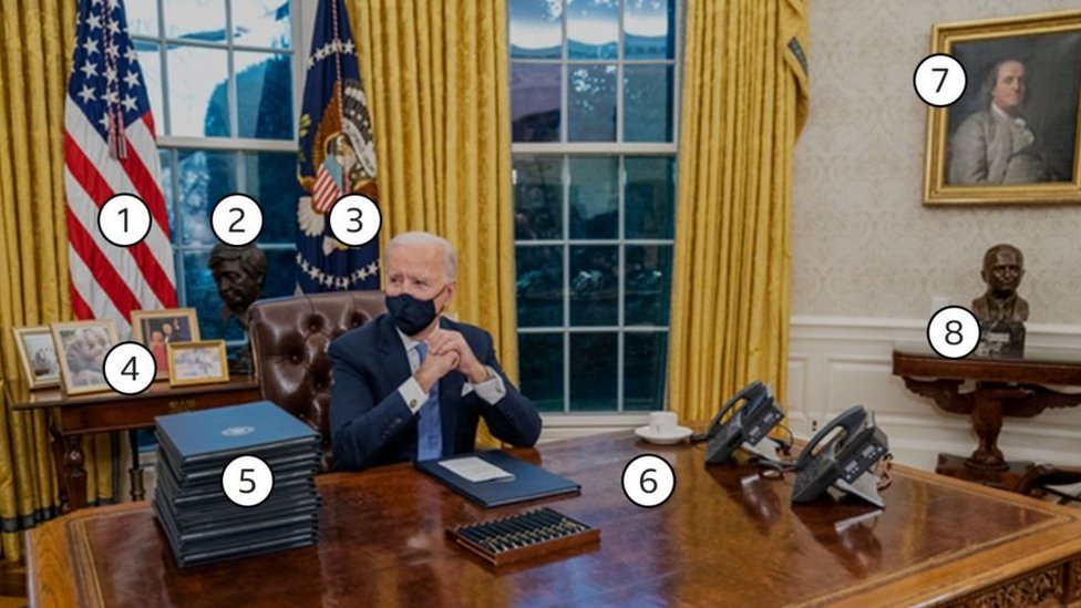 அதிபர் ஜோ பைடன் அலுவலகம் முழுக்க அமெரிக்க வரலாற்றின் முக்கிய மற்றும் செல்வாக்கு மிக்க தலைவர்களின் படங்களாலும் கற்சிலைகளாலும் நிரம்பியிருக்கிறது.