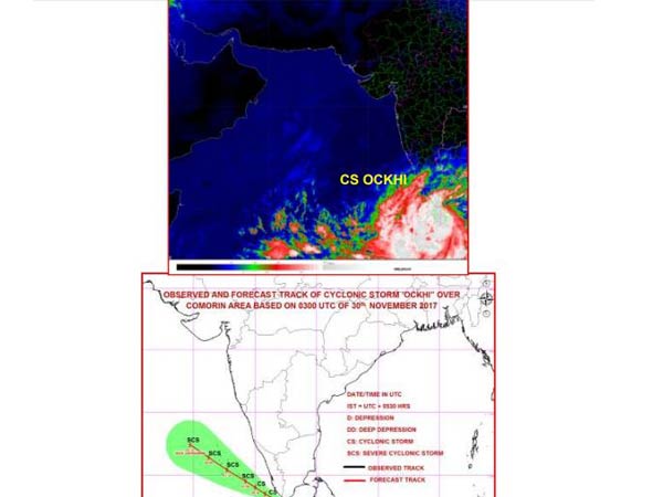 கன்னியாகுமரி அருகே நிலை கொண்டிருந்த காற்றழுத்த தாழ்வு பகுதியானது இன்று காலை 8.30 மணியளவில் ஓகி புயலாக மாறியது. இது இலங்கை மற்றும் கன்னியாகுமரி, திருவனந்தபுரம் ஒட்டியுள்ள கடற்பகுதியில் நீடிக்கிறது. ஓகி புயலானது மேலும் மேற்கை நோக்கி நகரும் என்று தெரிகிறது, இதனால் அடுத்த 24 மணி நேரத்திற்கு பலத்த சூறை காற்று வீசும் என்று இந்திய வானிலை மையம் தெரிவித்துளள்து.