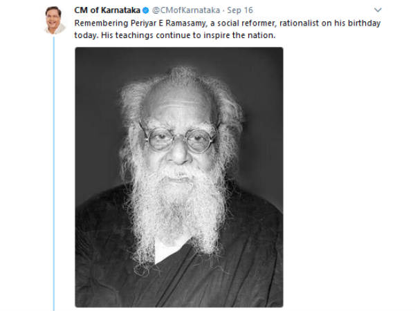 நேற்று தந்தை பெரியாரின் 139ஆவது பிறந்தநாள் கொண்டாடப்பட்டது. காங்கிரஸ் கட்சி துணை தலைவர் ராகுல் காந்தி, பீகார் ஆர்ஜேடி கட்சி லாலு பிரசாத் உள்ளீட்ட பல தலைவர்கள் பெரியாருக்கு டுவிட்டரில் வாழ்த்துத் தெரிவித்திருந்தனர். இந்நிலையில், கர்நாடக முதல்வர் சித்தராமையா பெரியாருக்கு வாழ்த்துத் தெரிவித்திருந்தார். மேலும் பெரியாரின் கருத்துகள் நாட்டுக்கு ஊக்கம் தருபவை என குறிப்பிட்டிருந்தார்.
