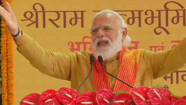 அடிக்கல் நாட்டு விழா நடைபெற்றதும், அருகே அமைக்கப்பட்ட மேடையில், நிகழ்ச்சியில் பங்கேற்ற விஐபிகள் அமர வைக்கப்பட்டனர். உ.பி. முதல்வர் யோகி ஆதித்யநாத், ஆர்எஸ்எஸ் தலைவர் மோகன் பகவத் ஆகியோர் உரைக்கு பிறகு, பிரதமர் மோடி ஜெய் சியாராம் என்ற கோஷத்துடன் தனது உரையை துவங்கினார்.