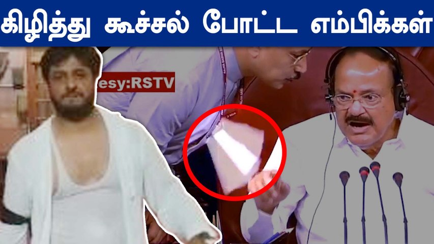 இதையடுத்து மக்கள் ஜனநாயக கட்சி எம்.பிக்களை சபையை விட்டு வெளியேற வெங்கையா நாயுடு உத்தரவு பிறப்பித்தார். காங்கிரஸ் எம்பிக்கள் தொடர்ந்து அவையில் கூச்சலிட்டு வருகிறார்கள்.