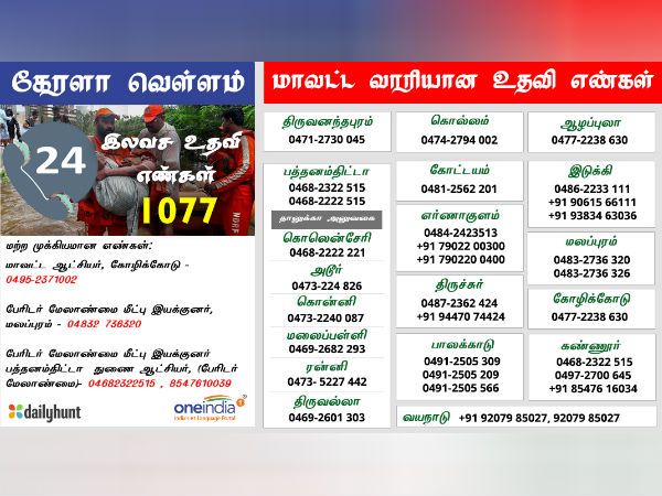 திருவனந்தபுரம்: கேரளாவில் ஏற்பட்டு இருக்கும் வெள்ளம் குறித்து தகவல் தெரிவிக்கவும், உதவி கேட்கவும், தற்போது அவசர உதவி எண்கள் அறிவிக்கப்பட்டுள்ளது. மாவட்ட வாரியாக உதவி எண்கள் அறிவிக்கப்பட்டுள்ளது.