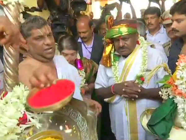 கர்நாடகத் தேர்தலில் வெற்றி பெற்றதையொட்டி ஹாசன் லஷ்மி நரசிம்மர் கோவிலில் குமாரசாமி வழிபட்டார்.