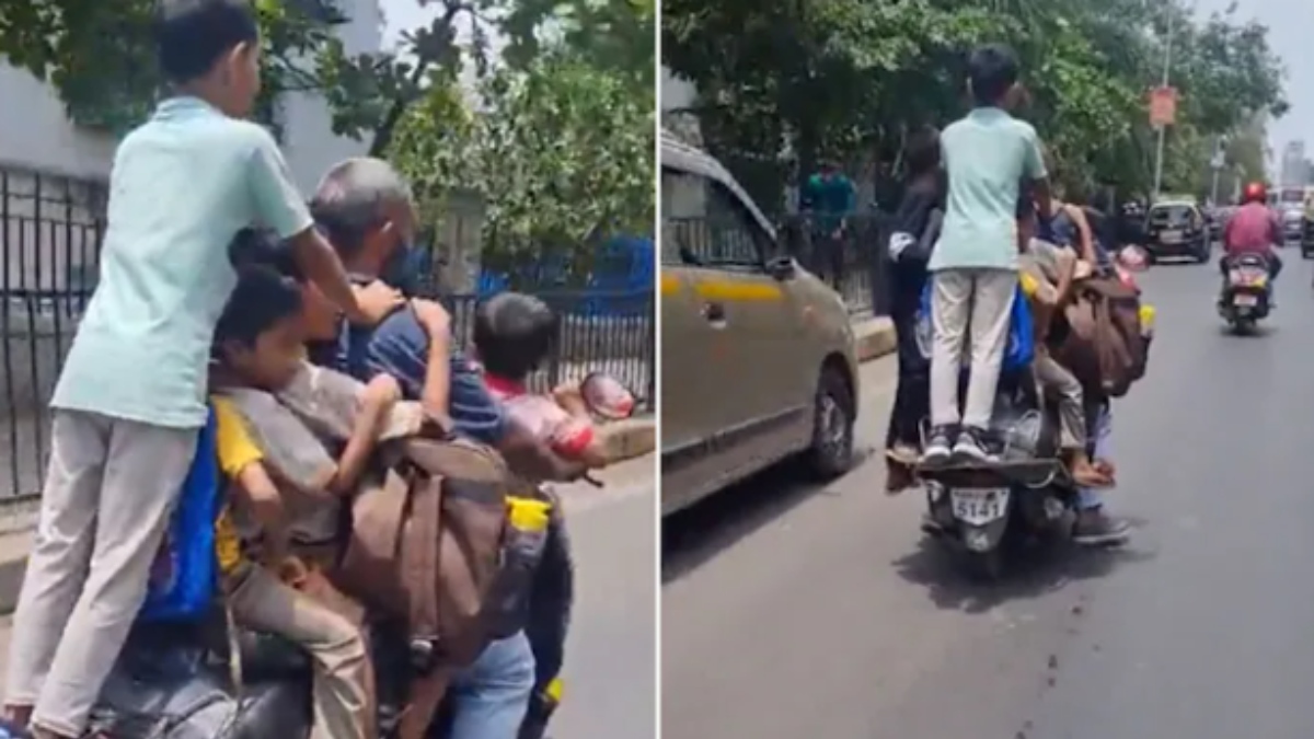 இரு சக்கர வாகனத்த்தில் 3 குழந்தைகள் மற்றும் 4 சிறுவர்கள் என மொத்தம் 7 பேரை ஏற்றிக்கொண்டு மும்பையில் ஒருவர் சென்றது வாகன ஓட்டிகளுக்கு அதிர்ச்சியை கொடுத்தது. மும்பையின் பரபரப்பான சாலையில் குழந்தைகளை வைத்து ஆபத்தான பயணத்தை முனவர் ஷா என்பவர் மேற்கொண்டு இருந்தார். 2 குழந்தைகள் முன்பக்கம் நின்ற படியும் 3 பேர் பின் இருக்கையில் அமர்ந்து கொண்டும், மேலும் இரு சிறுவர்கள் பின்பக்கம் உள்ள கம்பியில் நின்ற படியும் சென்றனர்.