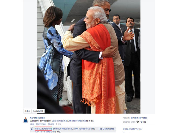 அமெரிக்க அதிபர் ஒபாமாவை பிரதமர் நரேந்திர மோடி கட்டிப் பிடித்து வரவேற்கும் புகைப்படத்துக்குத்தான் லைக் கொடுத்துள்ளார் மார்க்.