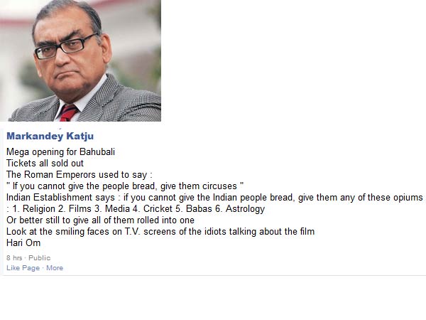 இந்நிலையில் இதுகுறித்து மார்கண்டேய கட்ஜு தனது பேஸ்புக் பதிவில் குறிப்பிடுகையில், பாகுபலி 2 படத்துக்கான டிக்கெட்டுகள் அனைத்தும் விற்றுத் தீர்ந்தன என்ற தகவலை பார்க்கும்போது மக்களுக்கு அரசியல்வாதிகள் ஒன்றும் செய்யவில்லை எனிலும் அவர்களை திசைதிருப்பும் முயற்சிகளை நன்கு செய்கின்றனர்.