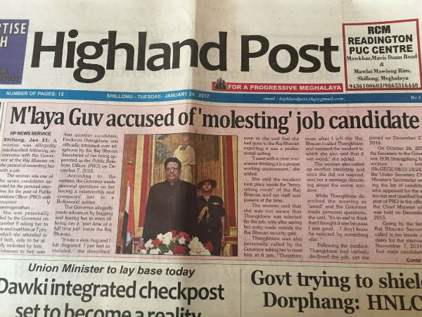 மேகலாயா மாநில ஆங்கில நாளேடான "Highland Post" நேற்று முன்தினம் தலைப்புச் செய்தியாக, நேர்முக தேர்வுக்கு வந்த பெண்ணுக்கு பாலியல் தொந்தரவு கொடுத்ததாக ஆளுநர் மீது புகார் என்ற தலைப்பில் சண்முகநாதன் படத்துடன் செய்தி வெளியிட்டது. இது வடகிழக்கு மாநிலங்களில் பெரும் பரபரப்பை ஏற்படுத்தியது.