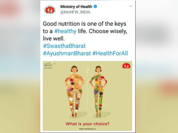 மத்திய சுகாதார மற்றும் குடும்ப நலத்துறை அமைச்சகம் ட்விட்டரில் ஒரு பதிவை வெளியிட்டிருந்தது. அதில் உங்களது தேர்வு என்ன சைவமா அல்லது அசைவமா என்று இரண்டு புகைப்படங்களைக் காட்டி ஒப்பிடுவது போல அமைந்துள்ளது.
