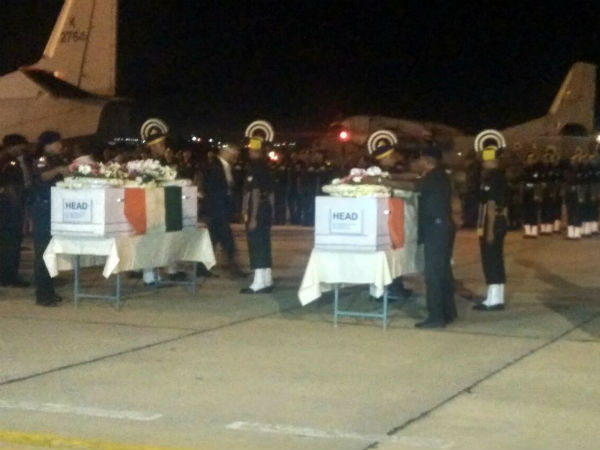 டெல்லியில் இருந்து விமானப்படைக்கு சொந்தமான விமானத்தில் 7 வீரர்களின் உடல்கள் பெங்களூரில் உள்ள ஹெச்.ஏ.எல். விமான நிலையத்திற்கு திங்கட்கிழமை இரவு 7.15 மணிக்கு வந்தது. விமானம் 5.30 மணிக்கே பெங்களூருக்கு வருவதாக இருந்தது. அதனால் பத்திரிக்கையாளர்கள் 5 மணிக்கே விமான நிலையத்திற்கு வந்து காத்திருந்தனர்.