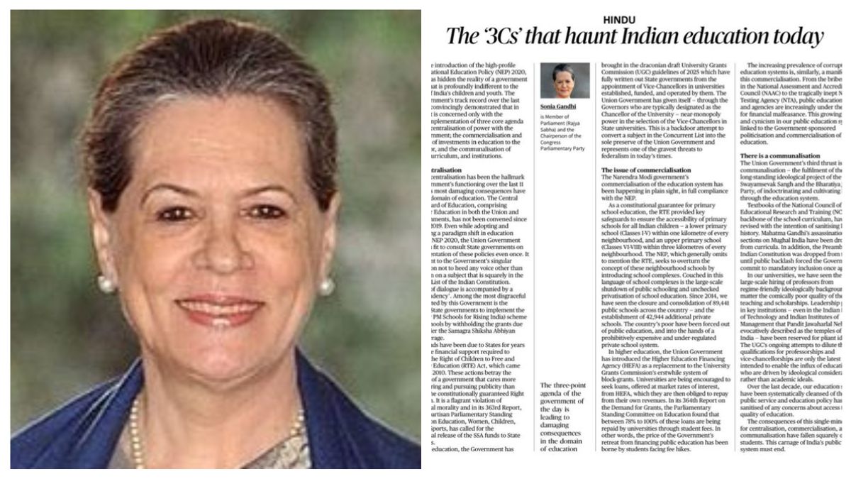 கல்வி நிறுவனங்களில் நியமனங்கள் என்பதே ஒரு சித்தாந்த அடிப்படையில் மேற்கொள்ளப்பட்டு வருவதுதான் இதற்கு காரணமாகும். கல்வி முறையில் மாநில அரசுகளை ஒதுக்குகிற போக்கும் மிக ஆபத்தானது. மத்திய பாஜக அரசின் இந்த நடவடிக்கைகள், இந்திய பொதுக் கல்வி முறை மீதான அப்பட்டமான படுகொலையை முடிவுக்கு கொண்டு வர வேண்டும். இவ்வாறு சோனியா காந்தி எழுதியுள்ளார்.
