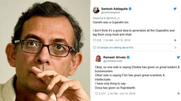 சந்தோஷ் என்ற ட்வீட்டிஸ்ட், காந்தி கூட குஜராத்திதான்.. மோடி மற்றும் அமித்ஷாவை முன்வைத்து குஜராத்திகளை பொதுமைப்படுத்திவிடக் கூடாது என சமாதானம் செய்திருக்கிறார். இன்னொருவர் ரஜினிகாந்தையும் கோர்த்துவிட்டிருக்கிறார். ரமேஷ் ஶ்ரீவத்ஸ் என்பவர், டோக்ளா சாப்பிட்டவர்கள் பெரிய தலைவர்கள்- தொழிலதிபர்கள்; மீன் சாப்பிட்டவர்கள் பெரிய விஞ்ஞானிகள்- அறிவுஜீவிகள்.. நான் சொல்ல வருவது தோசைதான் நமக்கு ரஜினிகாந்தை கொடுத்திருக்கிறது என்பதுதான் என கூறியுள்ளார்.