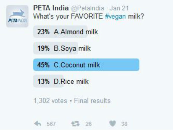 டிவிட்டரில் வலிந்து திணித்து இப்படி ஒரு கருத்துக் கணிப்பை நடத்தியது பீட்டா. அதில் எந்த சைவ பாலை அருந்துவீர்கள் என கேட்டு , பாதாம் மில்க், சோயா மில்க், தேங்காய் பால், அரிசி மில்க் என நான்கு ஆப்ஷன்கள் கொடுக்கப்பட்டன.