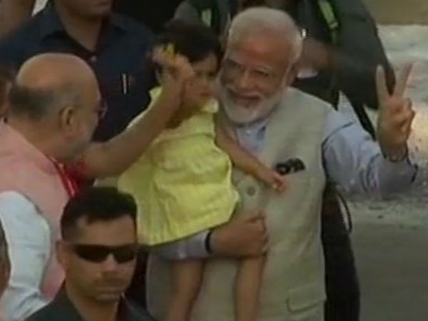 அப்போது வெளியே அமித்ஷாவின் பேத்தியை பார்த்ததும் மகிழ்ச்சியில் வாரி தூக்கி வைத்து கொண்டார். அமித்ஷா கொஞ்சி கொஞ்சியே ஃபேமஸ் ஆனவள் அந்த குட்டி பேத்தி. இப்போது மோடி குழந்தையை ஒரு கையில் தூக்கி வைத்து கொண்டு, மறுகையில் "வி" என்ற விக்டரி சின்னத்தை காட்டினார். (நமக்கு பழக்கதோஷமோ என்னவோ.. பார்க்க இரட்டை இலை போலவே தெரிகிறது)