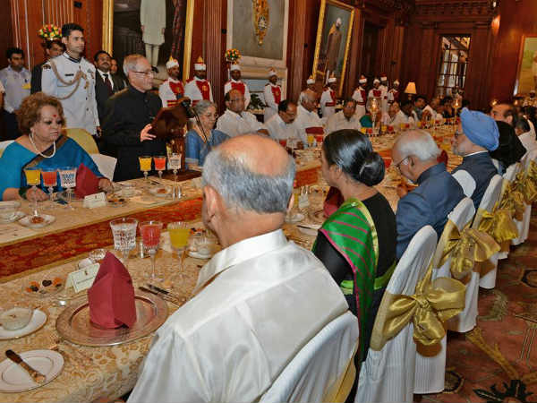 சைவப் பிரியர்களுக்காக பொடோல் தொர்மா, அஞ்ஜீர் கே கோப்தே, கார்ஹி பகோரா, பன்னீர் பசந்தா உள்ளிட்டவை பரிமாறப்பட்டன. இந்த விருந்தில் எதிர்கட்சி தலைவர் சுஷ்மா ஸ்வராஜும் கலந்து கொண்டனர். விருந்தில் பரிமாறப்பட்ட உணவு வகைகளை அனைவரும் ரசித்து சாப்பிட்டனர்.