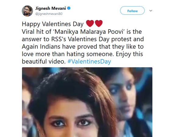 மணிக்யா மலரய பூவி பாடல் வைரல் ஹிட்டானதே காதலர் தினத்தை எதிர்க்கும் ஆர்எஸ்எஸ்க்கான பதில் என்று ஜிக்னேஷ் மேவானி கூறியுள்ளார்.