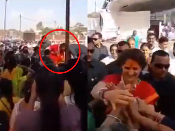 இந்த நிலையில் முதலில் தடுப்பு கட்டைகளுக்கு வெளியே நின்று கொண்டு பிரியங்கா காந்தி மக்களுடன் பேசிக்கொண்டு இருந்தார். அதன் பின் அங்கிருந்த பெண்களை பார்த்ததும் உற்சாகம் அடைந்த பிரியங்கா காந்தி உடனே கூட்டத்தில் குதிக்க சென்றார்.