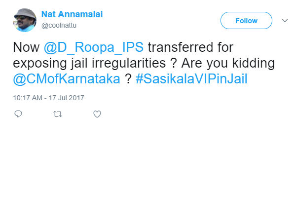 சசிகலாவுக்கு அளிக்கப்பட்ட வசதிகளை வெளிப்படுத்திய போலீஸ் அதிகாரி மாற்றப்பட்டிருப்பது உங்களுக்கு அவமானம் என்கிறது இந்த ட்வீட்