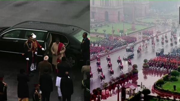 சினாப்: தலைநகர் டெல்லியில் கொட்டும் மழைக்கு நடுவே முப்படைகள் பாசறை திரும்பும் நிகழ்ச்சி நடைபெறுகிறது.