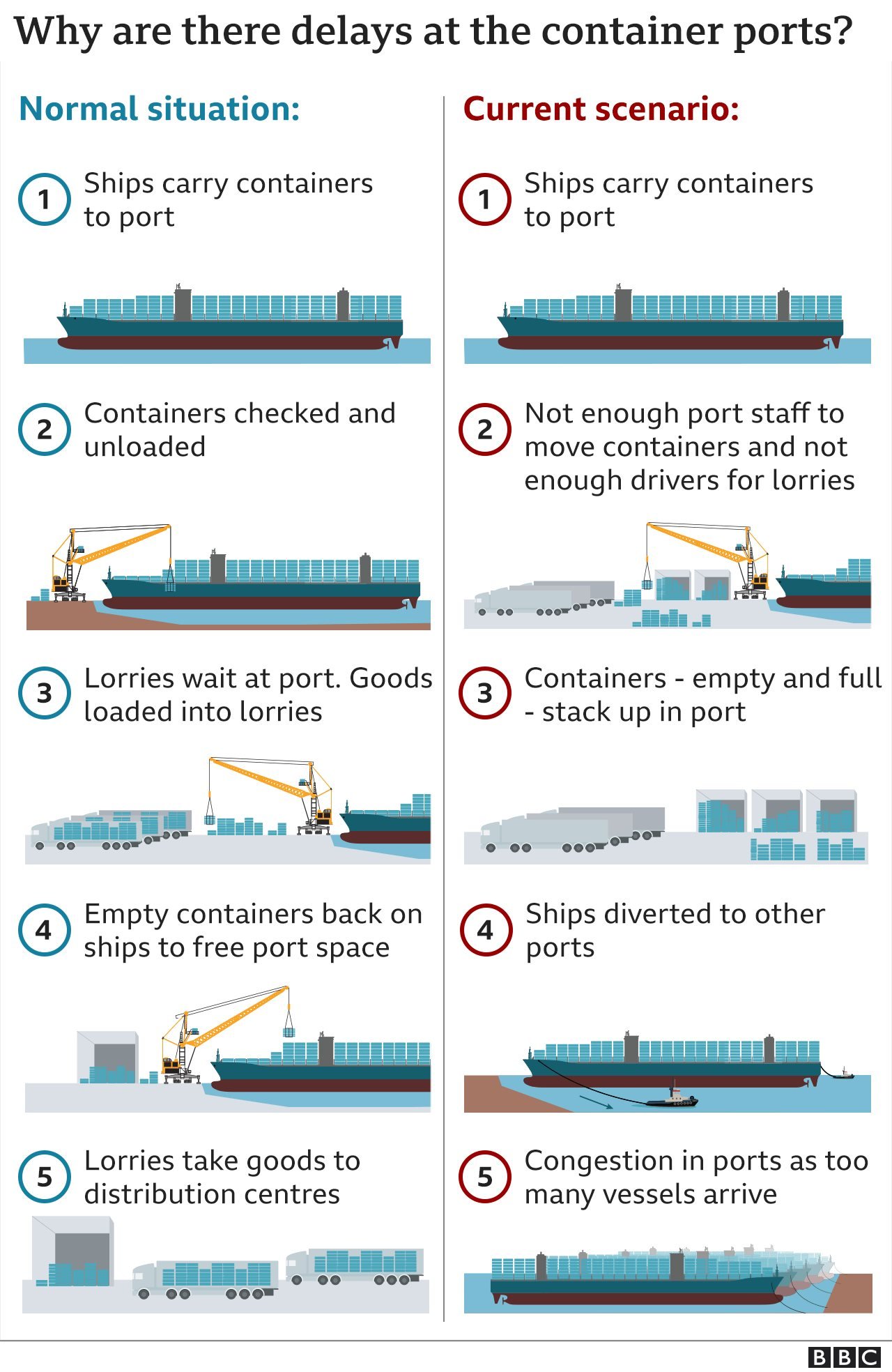 பணியாளர்கள் பிரச்சனை உள்ளது என சர்வதேச பொருளாதாரத்திற்கான பீட்டர்சன் இன்ஸ்டிட்டியூட்டின் மூத்த உறுப்பினரான கேரி ஹஃப்வர் கூறுகிறார். திறன் படைத்த துறைமுக தொழிலாளர்கள், லாரி டிரைவர்கள் மற்றும் ரயில் குழுவினர் பற்றாக்குறை நிலவுகிறது.
