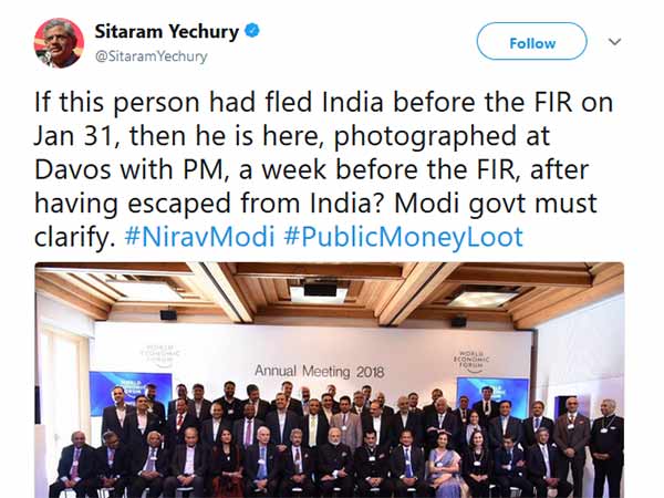 அத்துடன் பிரதமர் மோடியுடன் நீரவ் மோடி இணைந்து எடுத்த புகைப்படத்தையும் யெச்சூரி பகிரிந்துள்ளார்.