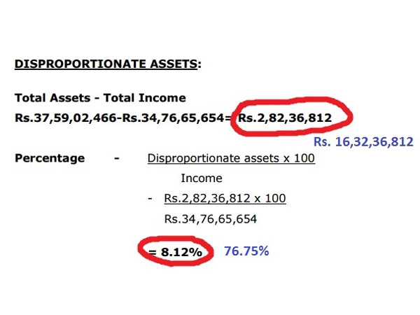 இதன் அடிப்படையில்தான் வருவாய்க்கு அதிகமாக ஜெயலலிதா 8.12 சதவீதம் மதிப்புக்கு மட்டுமே சொத்து சேர்த்துள்ளதாக கூறியுள்ளார். ஆனால், உண்மையான கடன் தொகையை வைத்து கணக்கிட்டு பார்த்தால் வருமானத்தைவிட 76.75 சதவீதம் அளவுக்கு கூடுதலாக சொத்து சேர்த்துள்ளது தெரியவருகிறது.