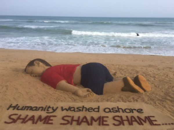 புவனேஸ்வர்: கிரீஸ் நாட்டிற்கு அடைக்கலம் தேடிச் சென்ற இடத்தில் கடலில் மூழ்கி பலியான மூன்று வயது சிறுவன் அய்லானின் கோர மரணத்தை, மணற் சிற்பமாக தீட்டி தனது கண்டனத்தைத் தெரிவித்துள்ளார் பிரபல மணற் சிற்பக் கலைஞர் சுதர்சன் பட்நாயக். அந்த சிற்பத்தில், ‘மனிதநேயம் கரை ஒதுங்கிப் போனது. வெட்கம், கேவலம், அவமானம்' என அவர் குறிப்பிட்டுள்ளார்.