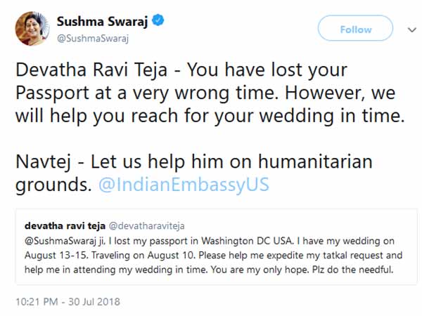இதற்கு சுஷ்மா சுவராஜ், ''தேவதா ரவி தேஜா, நீங்கள் முக்கியமான நேரத்தில் உங்கள் பாஸ்போர்ட்டை தொலைத்துவிட்டீர்கள். ஆனாலும் உங்கள் திருமணத்திற்கு நீங்கள் சரியாக செல்லும் படி நாங்கள் உதவுவோம்'' என்றுள்ளார். அதேபோல் இந்திய தூதரகத்திடம் உதவும்படி கட்டளையும் இட்டு இருக்கிறார்.