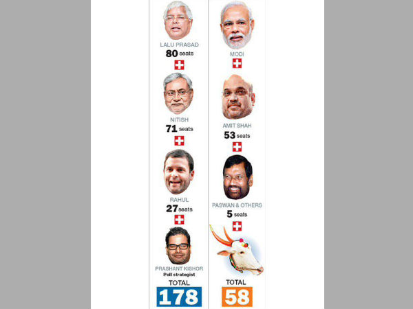 டெல்லி: பீகார் சட்டசபை தேர்தலில் மாட்டிறைச்சி விவகாரம் பிரதானமாக இடம்பெற்றிருந்த நிலையில் தி டெலிகிராப் ஏடு பாஜக கூட்டணியில் மாடுவையும் சேர்த்து 58 இடங்கள் என கிராபிக்ஸ் வெளியிட்டு பரபரப்பை கிளப்பியுள்ளது.