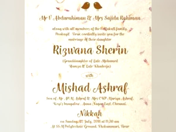 கேரளத்தில் எம்எல்ஏ ஒருவரின் மகள் திருமண வரவேற்பு விழாவுக்கு மறுசுழற்சி செய்யப்படும் பேப்பரில் தயாரிக்கப்பட்ட அழைப்பிதழ் விநியோகிக்கப்பட்டது.