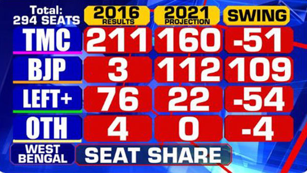 இந்நிலையில் டைம்ஸ் நவ்- சி வோட்டர்ஸ் இணைந்து நடத்திய கருத்துக்கணிப்பில் திரிணாமுல் காங்கிரஸ் கட்சி 160 இடங்களில் வென்று ஆட்சியை பிடிக்கும் என்று கூறப்பட்டுள்ளது. ஆனால் கடந்த முறை 3 இடங்களில் மட்டுமே வென்ற பாஜக இந்த முறை 112 இடங்களில் வெல்லும் என்று கூறப்பட்டள்ளது. இடதுசாரிகள் கூட்டணி 22 இடங்களில் மட்டுமே வெல்லும் என்று தெரிவிக்கப்பட்டுள்ளது.