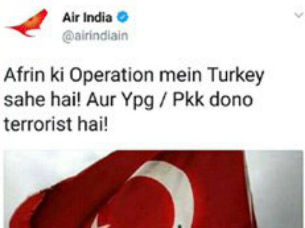 இந்த நிலையில் அவர்கள் ''நாங்கள் ஏர் இந்தியா கணக்கை ஹேக் செய்துவிட்டோம்'' என்று போஸ்ட் போட்டு உள்ளார்கள். ஒரு துருக்கி தீவிரவாதி அந்நாட்டு கொடியுடன் நிற்கும் புகைப்படத்தையும் வெளியிட்டு இருக்கிறார்கள். தற்போது இந்த டிவிட்டுகள் டெலிட் செய்யப்பட்டுள்ளது.