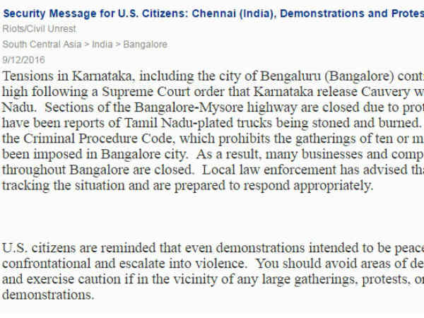 இதன் காரணமாக பெங்களூரில் அசாதாரண நிலை நிலவுகிறது. அமெரிக்க குடிமக்கள், போராட்டம் நடைபெறும் பகுதிகளுக்குச் செல்வதைத் தவிர்க்க வேண்டும். வன்முறை ஏற்படலாம் என்று கருதப்படும் பகுதிகளைத் தவிர்க்க வேண்டும். வெளியில் செல்லும்போது மிகுந்த முன்னெச்சரிக்கையுடன் செல்லுமாறு கேட்டுக் கொள்ளப்படுகிறார்கள் என்று அதில் தெரிவிக்கப்பட்டுள்ளது.