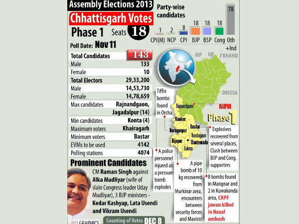 90 உறுப்பினர் கொண்ட சத்தீஸ்கர் சட்டசபை தேர்தல் இரு கட்டங்களாக நடைபெறுகிறது. மாவோயிஸ்டுகள் ஆதிக்கம் உள்ள பஸ்தர் மற்றும் ராஜ்நந்த்கான் பகுதிகளில் 18 தொகுதிகளில் நேற்று முதல் கட்ட தேர்தல் நடைபெற்றது.
