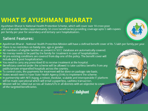 இது ஒரு தேசிய சுகாதார பாதுகாப்பு திட்டம். நாடு முழுக்க ஏழை, எளிய 10 கோடி குடும்பங்களுக்கு (ஏறத்தாழ 50 கோடி பலனாளிகள்) ஆண்டுக்கு தலா ரூ.5 லட்சம் வரையில் மருத்துவமனை செலவீனங்களை ஏற்கும் திட்டம் இதுவாகும்.
