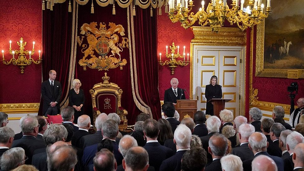 பிரிட்டனின் ஆறு முன்னாள் பிரதமர்கள் உள்ளிட்டோர் நிரம்பியிருந்த அறையில் இருந்தோர், அந்த வாசகத்தை மீண்டும் மீண்டும் கூறினர். பிறகு செயின்ட் ஜேம்ஸ் மாளிகையிலுள்ளா ஃப்ரையரி கோர்ட்டுக்கு மேலே இருக்கும் மாடத்தில் இந்தப் பிரகடனம் வாசிக்கப்பட்டது.