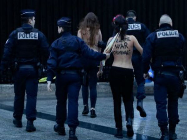 பாரிஸ்: அமெரிக்க அதிபர் டிரம்பிற்கு எதிர்ப்பு தெரிவிக்கும் விதத்தில் இரண்டு பெண்கள் மேலாடையால் இல்லாமல் அவருக்கு முன் ஓடி வந்த சம்பவம் பெரிய பரபரப்பை ஏற்படுத்தி இருக்கிறது.