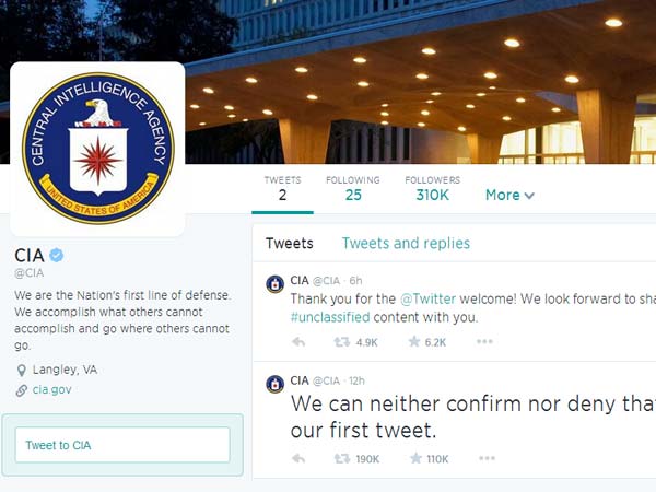 "இதுதான் எங்கள் முதல் கீச்சு என்பதை நாங்கள் உறுதி செய்யவும் இல்லை, அதே நேரம் மறுக்கவும் இல்லை" என்பதுதான் சிஐஏவின் முதல் ட்விட். கமலஹாசன் பேசும் வசனம் போல சுற்றிவளைத்து ஒரு தகவலை செல்ல வரும் இந்த ட்விட்டை, அர்த்தம் புரிந்தோ, புரியாமலோ மொத்தம் 1 லட்சத்து 87 ஆயிரம் பேர் ரீட்விட் செய்துள்ளனர். 1 லட்சத்து 8 ஆயிரம் பேர் பேவரைட் செய்துள்ளனர்.